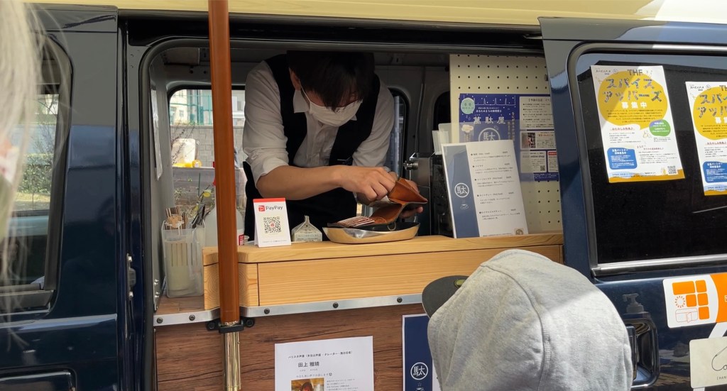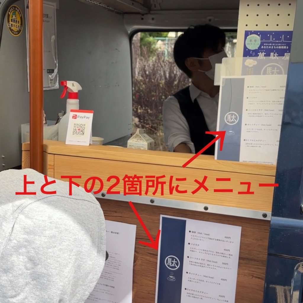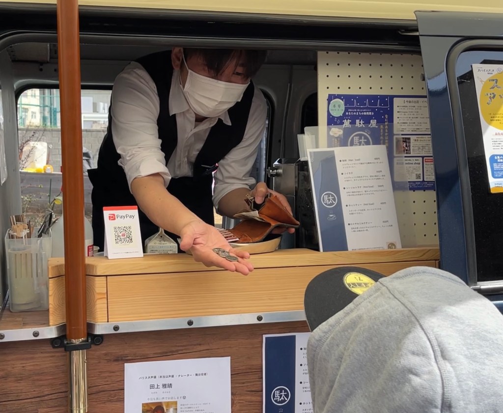 支払い時にお金を出そうとしましたが、カウンターの位置が高いので、ちょっと苦労されていました。キッチンカーの構造上、修正が難しそうですが、何か良い工夫があるとよいのですが…。人手に余裕があるときには、他のスタッフによるお手伝いも有効ですね。