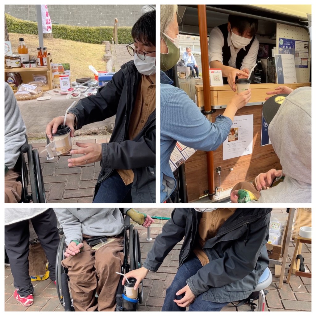 皆さんが暖かい雰囲気で、障害者の受入れを考えてもらう取組みはとてもありがたいと感じました。また、購入したコーヒーやクッキーはどれもおいしかったです。今回、お誘いを受けて参加しましたが、自分一人では輪に入りくさを感じて行けないかもしれないと感じました。自家用車を使用しているので、車椅子に乗り降りする広めのスペースや多目的トイレなど外出先に確保されているか確認するようにしています。