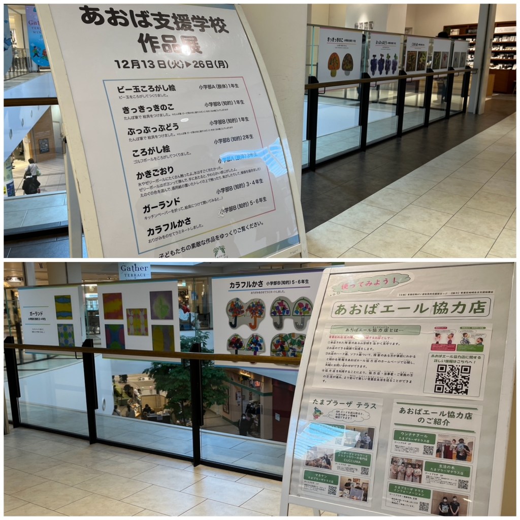 たまプラーザテラスさんのご協力により、2023年1月末まで、館内にてあおば支援学校小学部の作品展示を開催しています。同じ場所にあおばエール協力店のパネルも展示しています。お買い物のついでに立ち寄ってみてください。