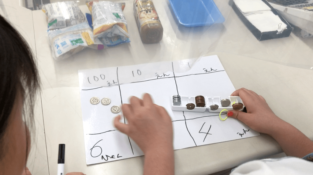 そして、ホワイトボードもレジにおいて、練習でやったのと同じように支払いました。今までの練習と実際のお買い物の支払いがつながった瞬間です。「ホワイトボードで練習した意味ってこれだったのね!」って皆さん合点していました。