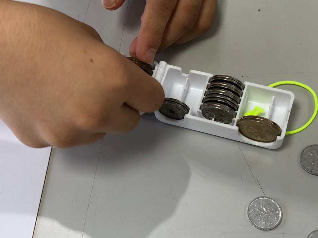 慣れてきたら5以上の数や「0」を入れ、「硬貨の枚数から値段を記入していたのを」今度は反対に「値段にあわせて硬貨の枚数を数えながら出していく」という練習を繰り返します。