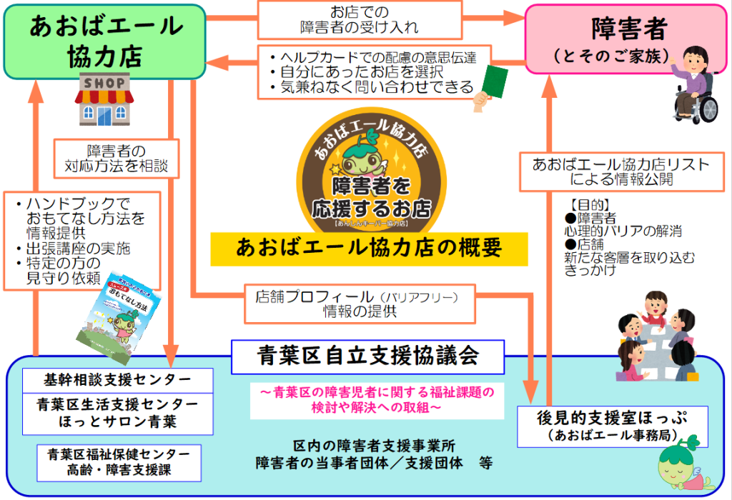 障害がある人でも、普通にお店で買い物ができたり…外食を楽しんだり…いろんな人と交流ができる街になったら…という願いのもと、2020年7月、青葉区自立支援協議会・地域づくり部会※にて「あおばエールプロジェクト」が発足しました。